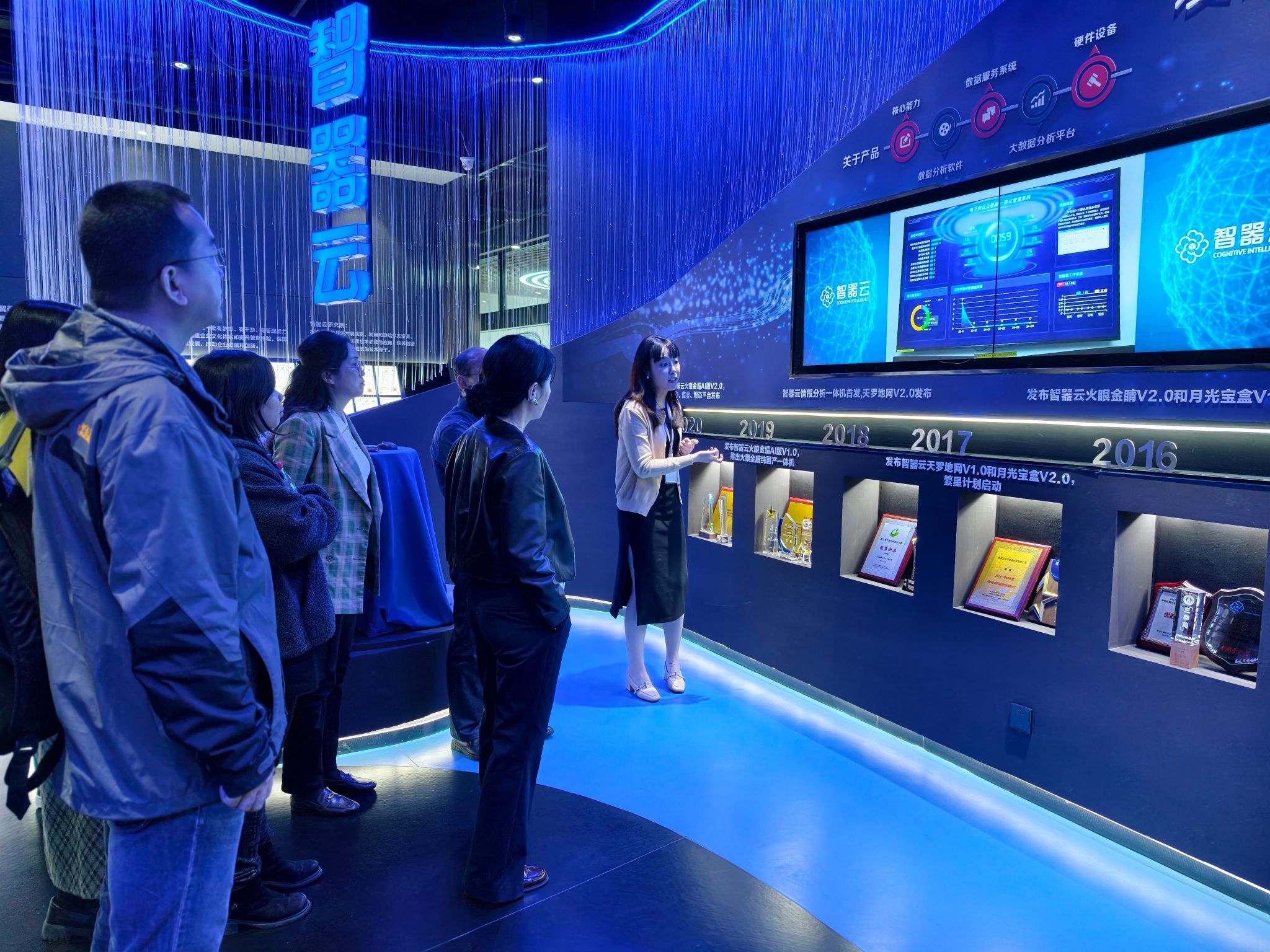 在交流环节,双方就前沿科技方向展开了分享和讨论。会后还参观了公司展厅,了解了智器云在大数据情报分析领域的技术创新与应用实践。