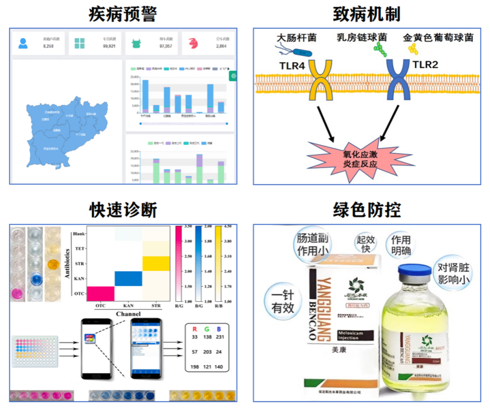 奶牛乳腺炎是制约奶业健康发展的重要疾病,长期面临致病机制不明、检测技术滞后、防控产品不足等瓶颈问题。苗晋锋教授团队以产业需求为导向,在致病机制解析、快速诊断技术研发及绿色防控产品创制等方面取得系列突破。团队阐明了我国奶牛主产区乳腺炎主要致病菌的流行态势和遗传规律,建立了菌种资源库及监测预警平台,揭示了金黄色葡萄球菌、乳房链球菌及大肠杆菌等诱发乳腺炎的共性机制,为广谱防治策略提供了新靶点。在此基础上,团队构建了涵盖炎性标志物、病原菌及其耐药性、抗生素残留的三大类生物传感检测体系,实现了乳腺炎的早期精准诊断;进一步研发出多种新型防控产品,有效降低了发病率并缓解了炎症损伤,最终形成“机制解析-精准诊断-绿色防治”一体化技术体系,为奶牛乳腺炎的综合防控提供了完整解决方案。